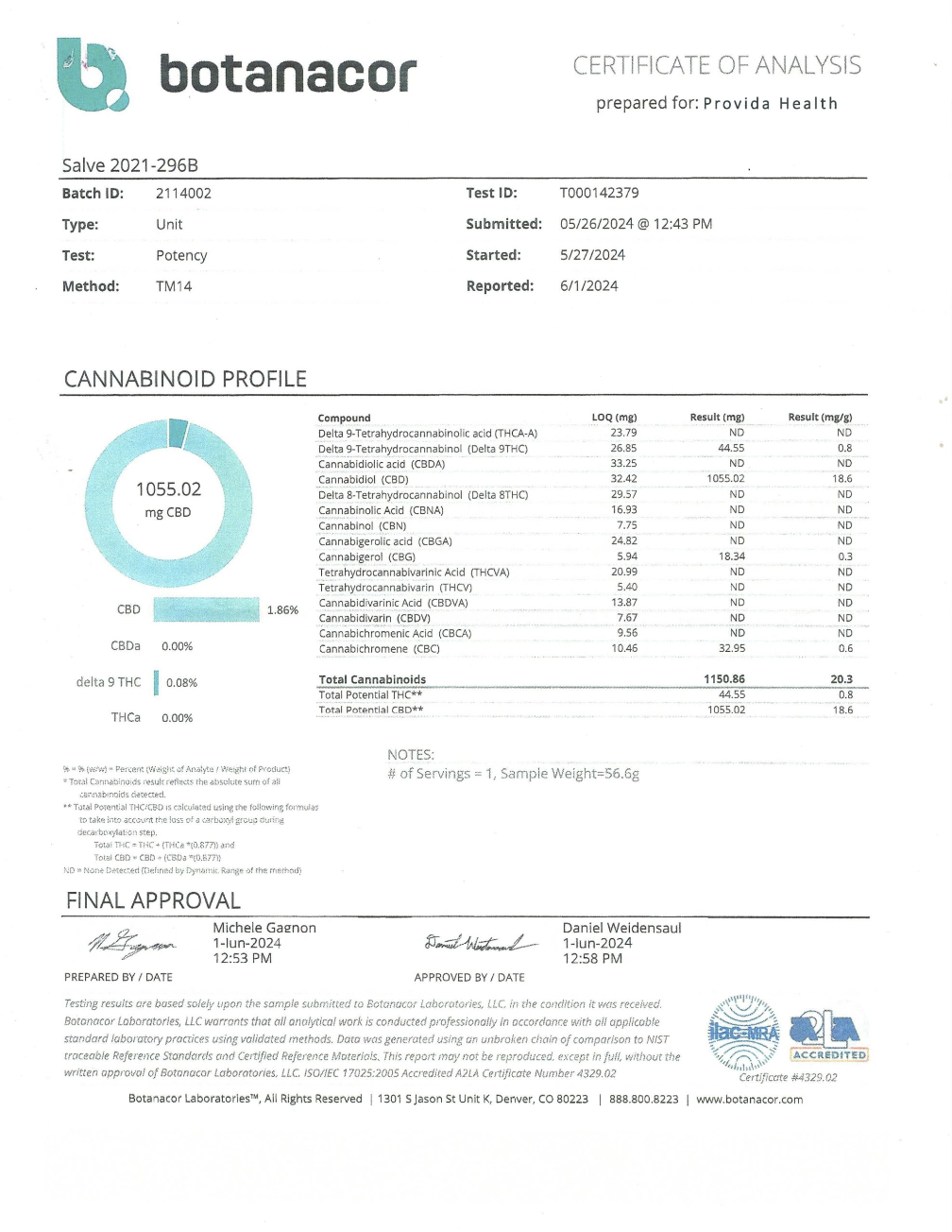 A Certificate of Analysis, or COA, helps ensure that a manufacturer’s products are made to specification, and indicates the quantity of cannabinoids found in each product, like CBD. In addition to cannabinoids, this certificate should show details on the levels of heavy metals, pesticides, solvents, and THC found in an individual batch of products.COAs are meant to keep customers safe and informed, but they also help emphasize quality. It’s one of the reasons we are an industry leader in terms of product quality, safety, and consistency.